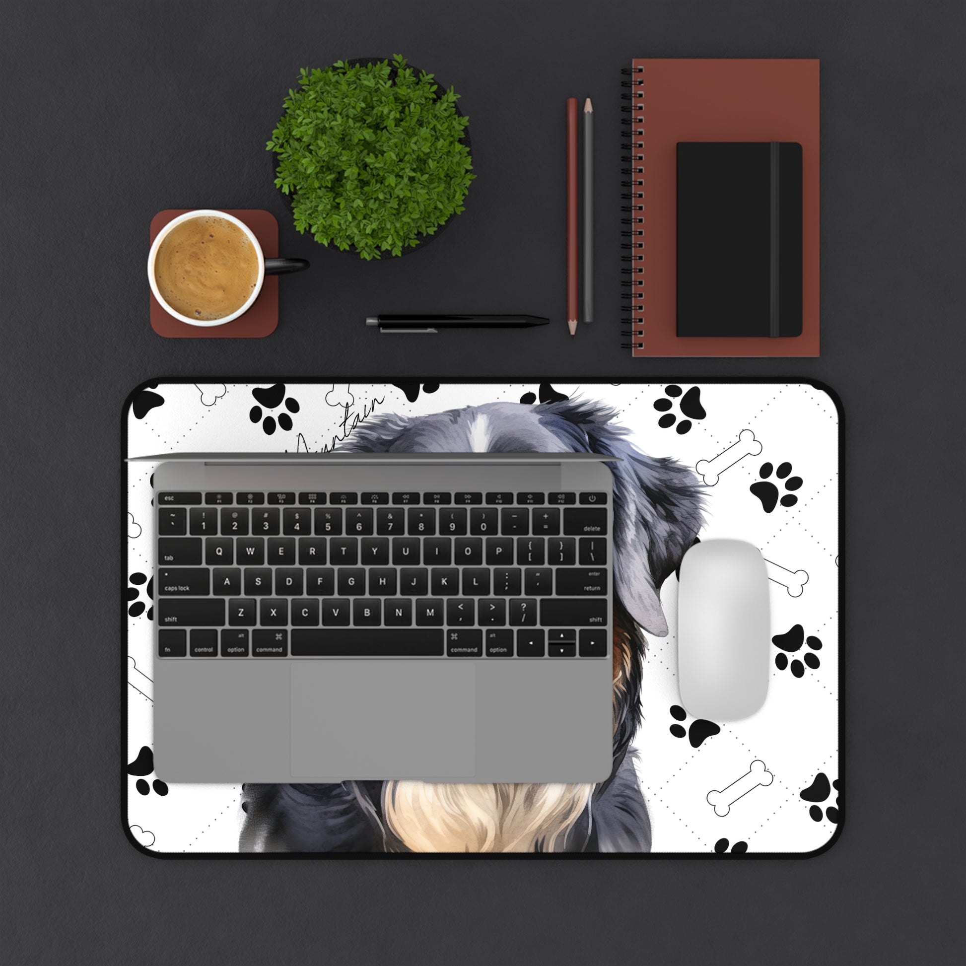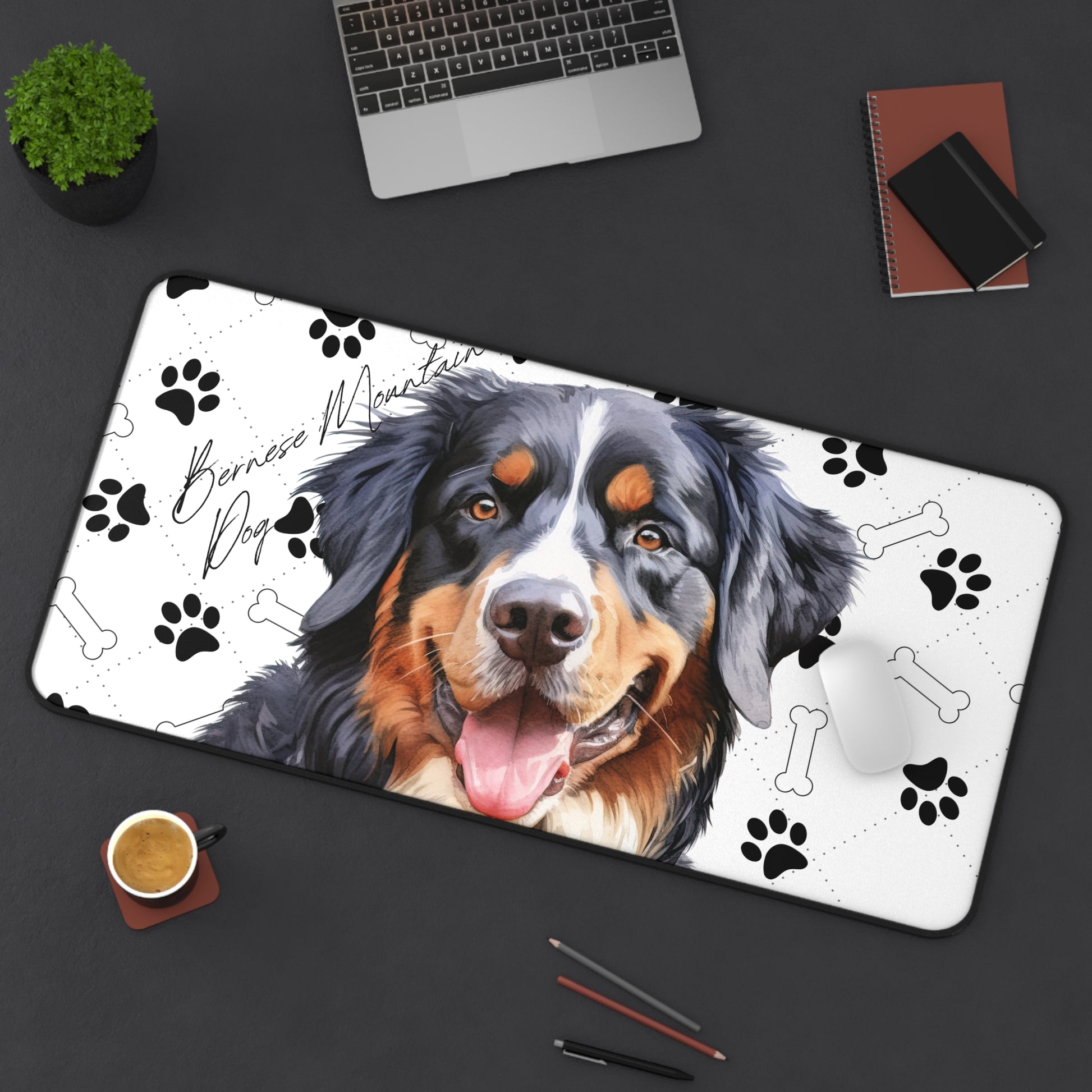 Immerse your workspace in the warmth and majestic charm of the Bernese Mountain Dog with our specially designed Desk Mat. This accessory is a celebration of the gentle giant of the canine world, known for its affectionate nature, striking tri-color coat, and robust stature. Featuring a beautifully detailed illustration of the Bernese Mountain Dog set against a whimsical background of paw prints and bones, this desk mat not only pays homage to the breed's friendly and calm demeanor but also adds a touch of coziness and character to your desk.
