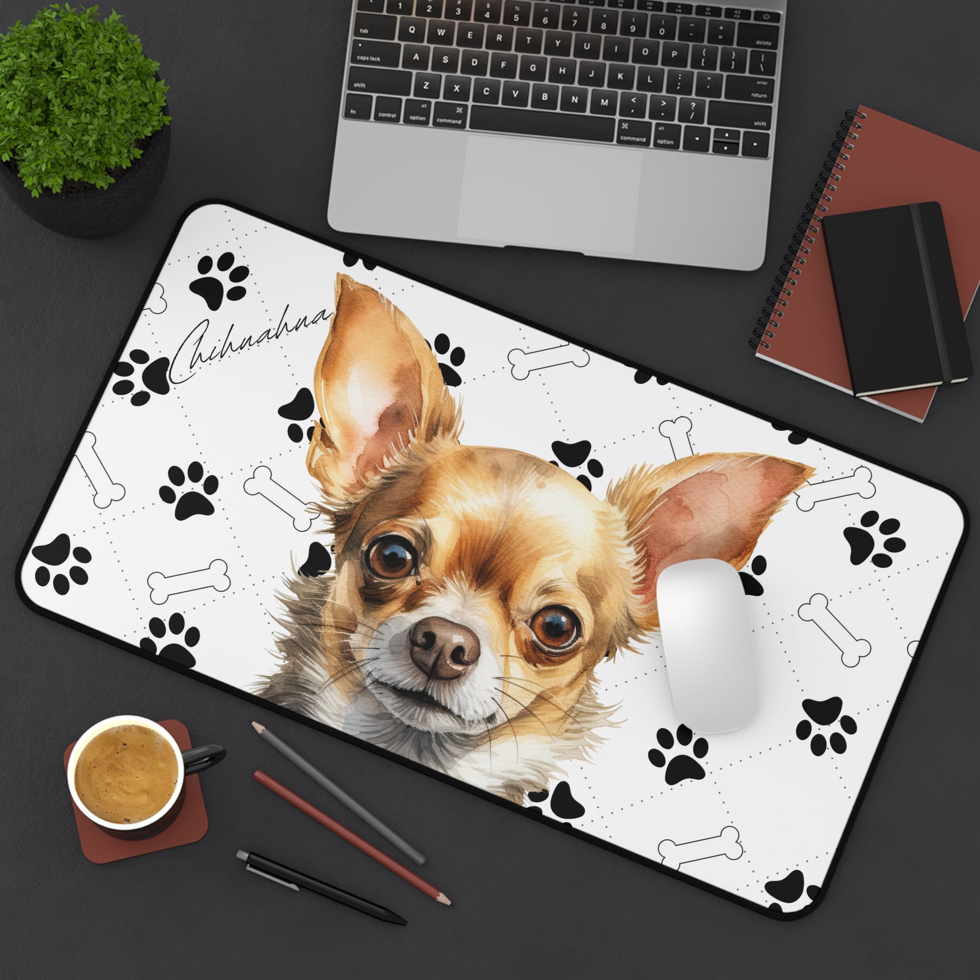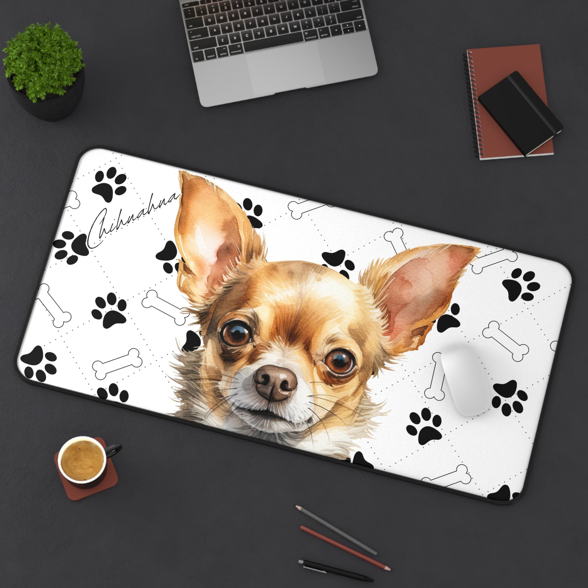 Introducing the Chihuahua Desk Mat, a vibrant and personality-packed addition to any workspace that celebrates the spirited and charming nature of one of the smallest dog breeds. Known for their bold temperament, loyalty, and expressive eyes, the Chihuahua is delightfully depicted on this desk mat, set against a playful backdrop of paw prints and bones. This design not only pays tribute to the breed's vivacious spirit but also adds a touch of whimsy and warmth to your desk.