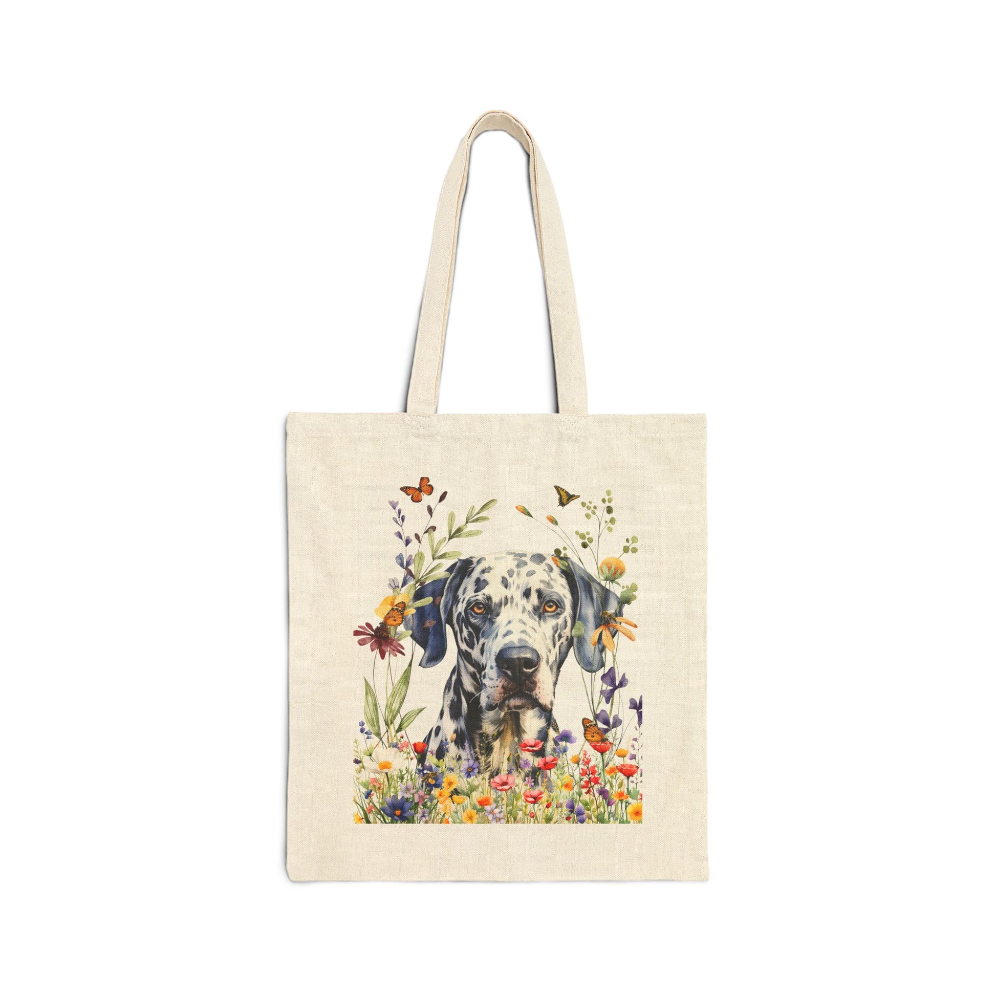 Elegant, energetic, and unmistakably iconic—the Dalmatian is beautifully captured on this eye-catching canvas tote. Surrounded by graceful wildflowers and fluttering butterflies, the design highlights the breed’s sleek coat, soulful eyes, and signature black spots. Known for their intelligence and flair, Dalmatians are as stylish as they are loyal.
