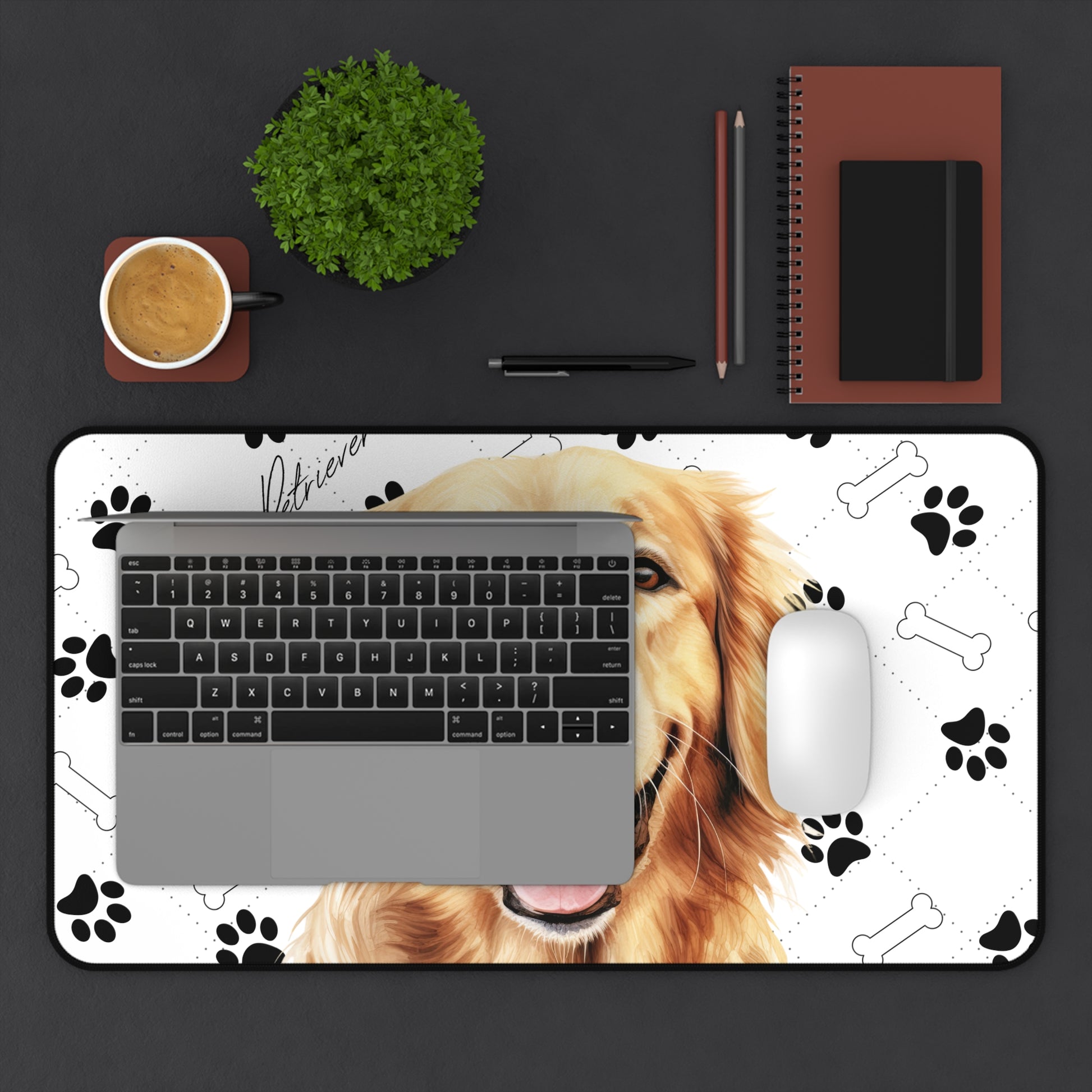 Introducing the Golden Retriever Desk Mat, a heartwarming and inviting addition to your workspace that encapsulates the affectionate nature and radiant beauty of the Golden Retriever breed. Celebrated for their gentle eyes, friendly smile, and lush golden coat, the Golden Retriever is beautifully illustrated on this desk mat, set against a playful and endearing backdrop of paw prints and bones. This design not only pays homage to the breed's loyal and friendly disposition but also adds a touch of warmth and positivity to your desk.