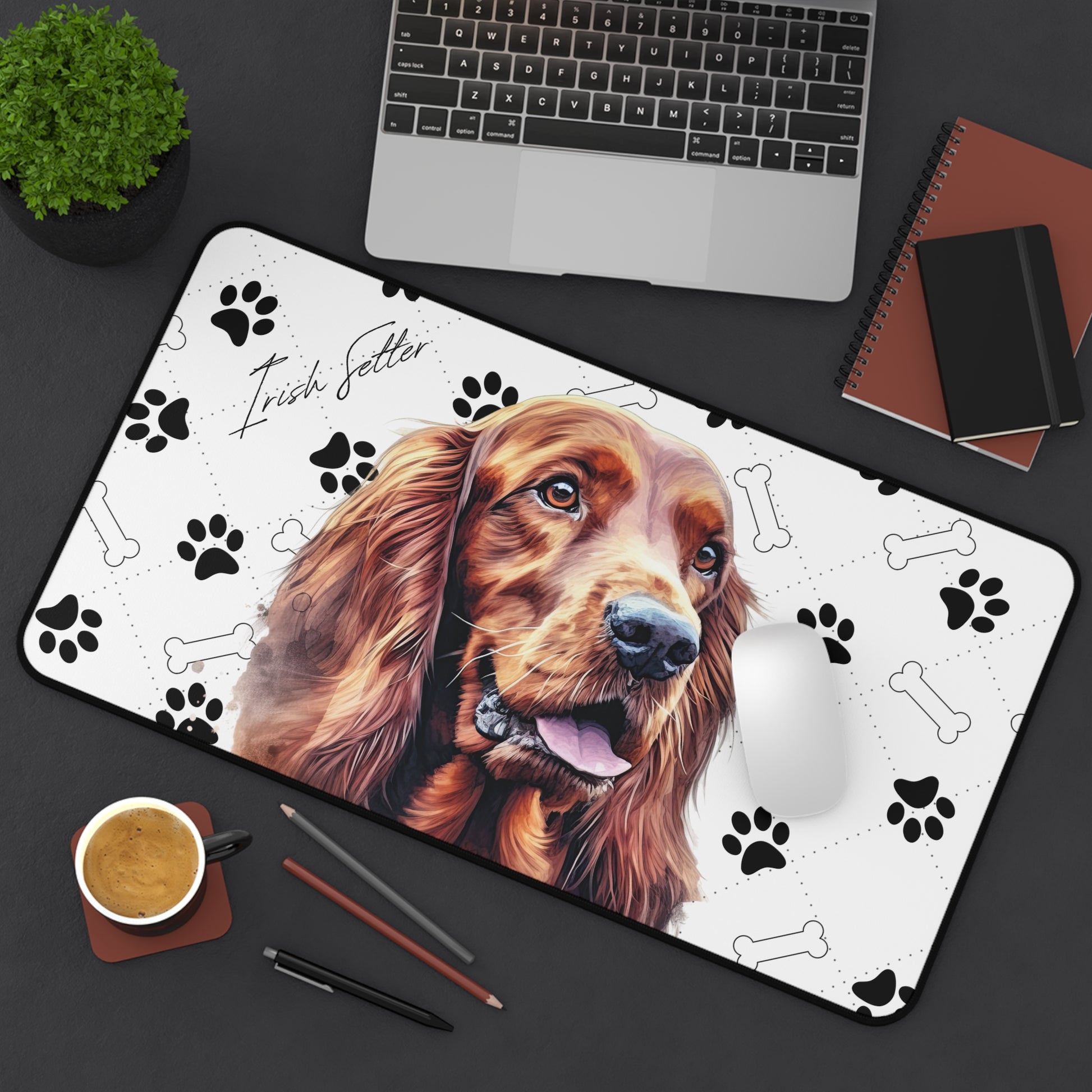 Introducing the Irish Setter Desk Mat, a sophisticated and vibrant addition to your workspace that celebrates the grace, energy, and stunning beauty of the Irish Setter breed. Renowned for their rich mahogany coat, friendly nature, and elegant demeanor, the Irish Setter is exquisitely depicted on this desk mat, set against a lively backdrop of paw prints and bones. This design not only pays homage to the breed's joyful spirit and impressive athleticism but also adds a touch of refined warmth and vitality to your desk.