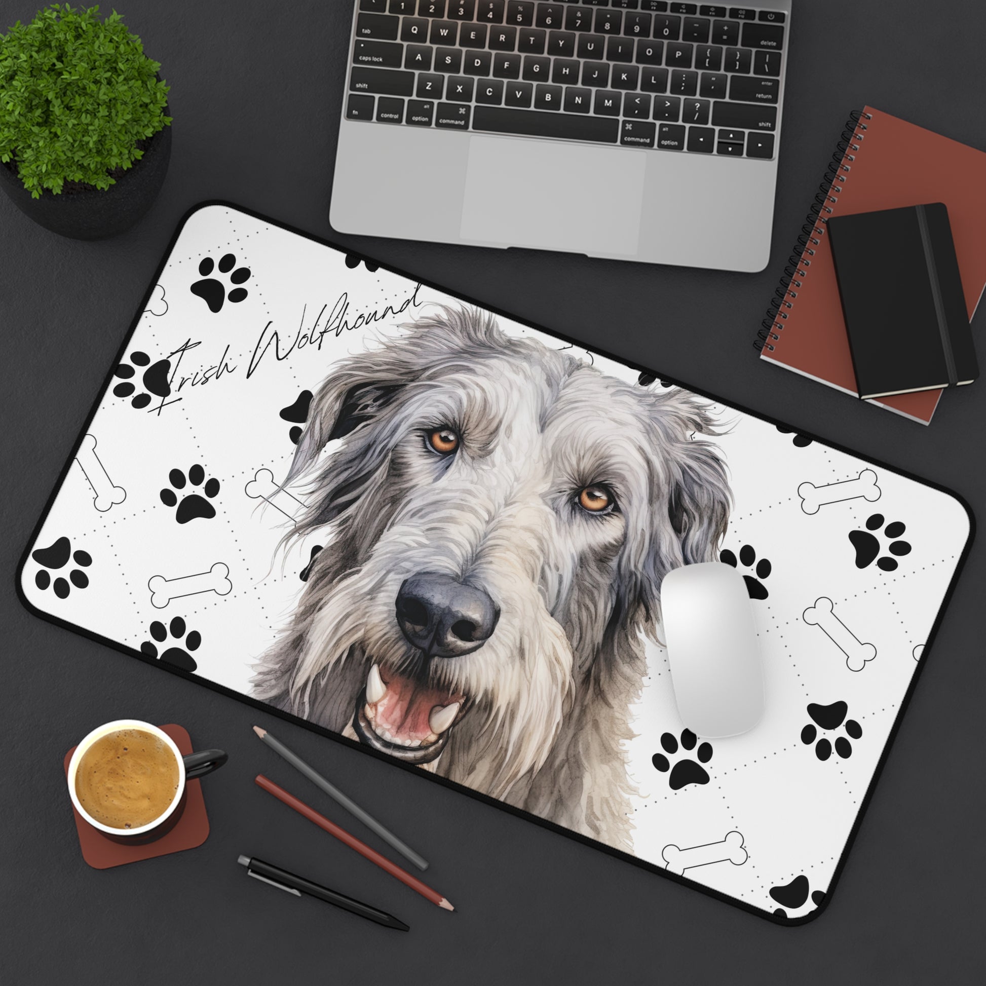 Introducing the Irish Wolfhound Desk Mat, a noble and majestic addition to your workspace that encapsulates the gentle strength and historic grandeur of the Irish Wolfhound breed. Known for their towering stature, gentle temperament, and shaggy coat, the Irish Wolfhound is magnificently depicted on this desk mat, set against a rustic backdrop of paw prints and bones. This design not only pays tribute to the breed's ancient lineage and dignified presence but also adds a touch of timeless elegance and serenity to your desk.