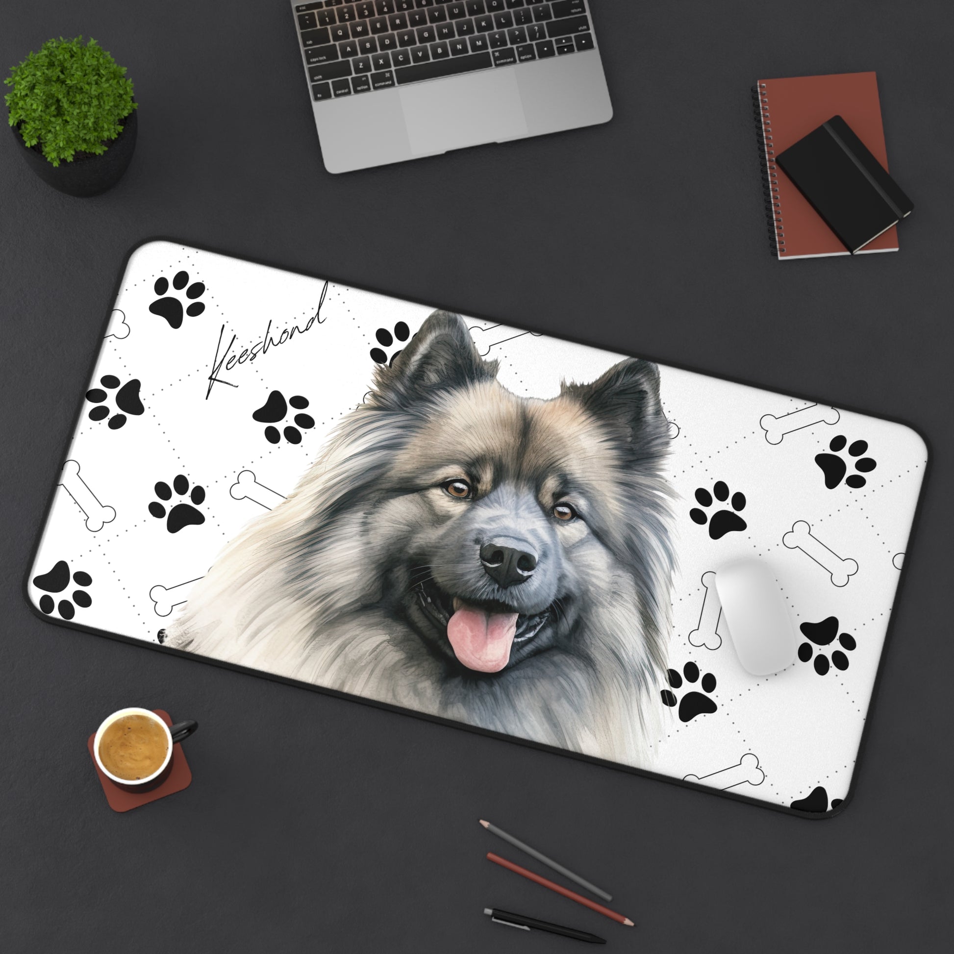Introducing the Keeshond Desk Mat, a uniquely designed and heartwarming addition to your workspace that captures the spirited essence and plush beauty of the Keeshond breed. Known for their striking "spectacles," luxurious silver and black coat, and friendly demeanor, the Keeshond is splendidly illustrated on this desk mat, set against an inviting backdrop of paw prints and bones. This design not only pays tribute to the breed's rich heritage as a companion and watchdog but also adds a touch of warmth and friendliness to your desk.