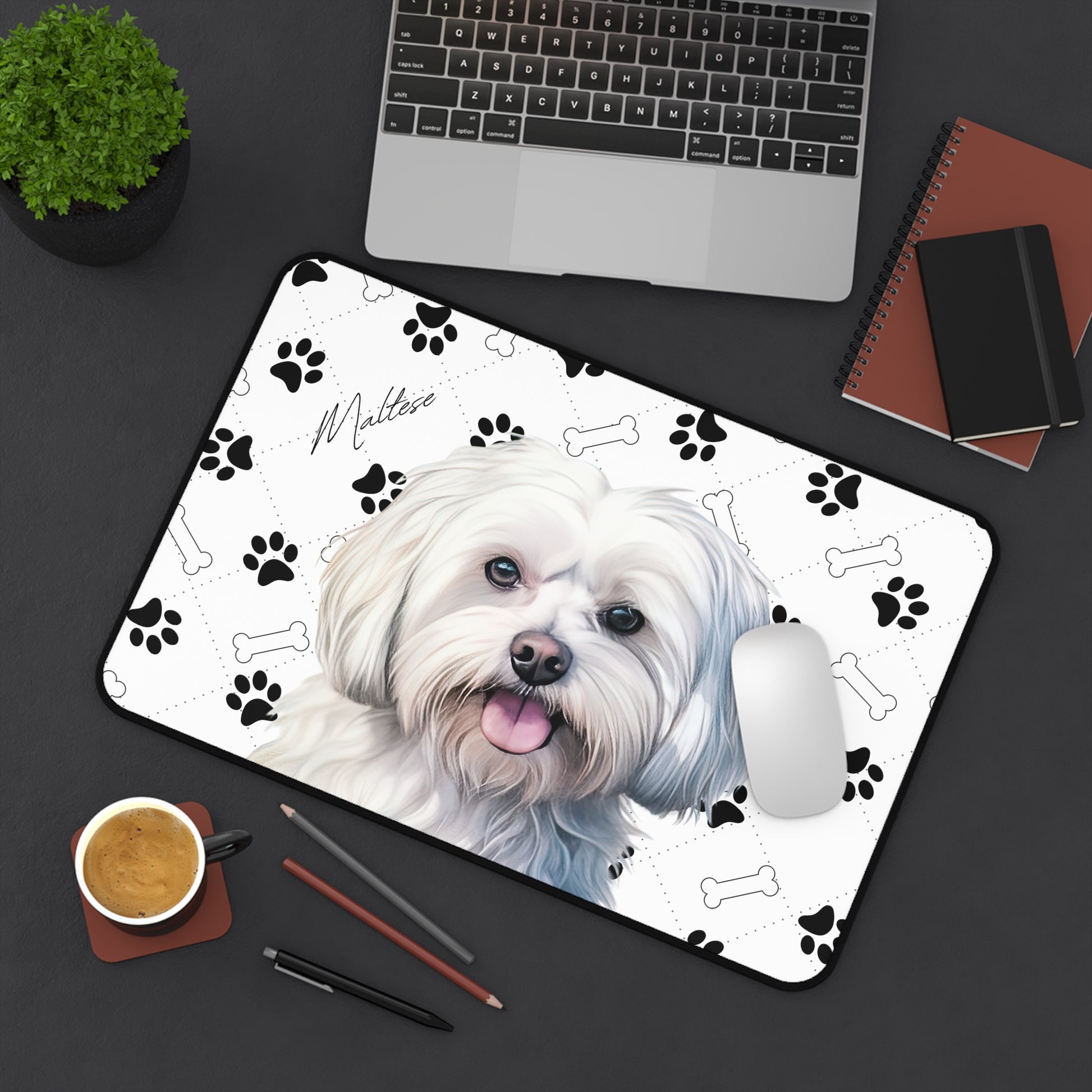 Introducing the Maltese Desk Mat, a delightful and charming addition to your workspace that captures the elegance and playful spirit of the Maltese breed. Known for their silky white coat, expressive eyes, and gentle disposition, the Maltese is beautifully illustrated on this desk mat, set against a whimsical backdrop of paw prints and bones. This design not only pays homage to the breed's ancient lineage and affectionate nature but also adds a touch of elegance and cheerfulness to your desk.