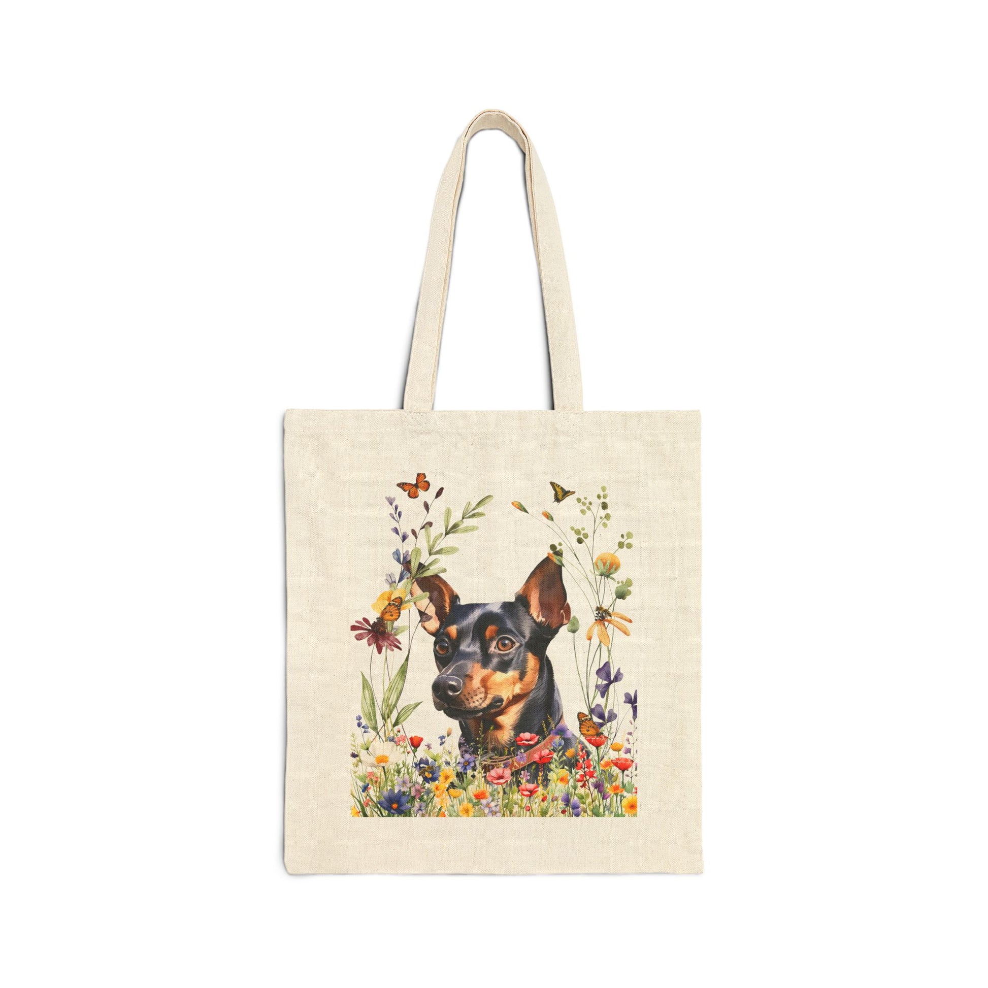 Fearless, sleek, and full of sass—the Miniature Pinscher shines on this striking canvas tote. Framed by fluttering butterflies and delicate wildflowers, the design captures the breed’s proud stance, alert ears, and fiery spirit. Affectionately known as the “King of Toys,” the Min Pin may be small in size, but it carries a bold and confident heart.