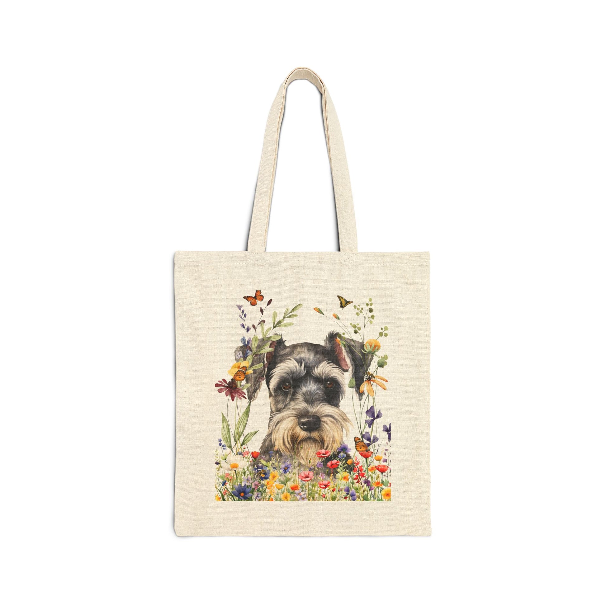 Alert, spirited, and full of character—the Miniature Schnauzer is perfectly portrayed on this stylish canvas tote. Surrounded by delicate wildflowers and fluttering butterflies, the artwork captures the breed’s signature beard, expressive eyebrows, and confident stance. Known for their loyalty, intelligence, and lively personality, Mini Schnauzers are small dogs with a big presence.