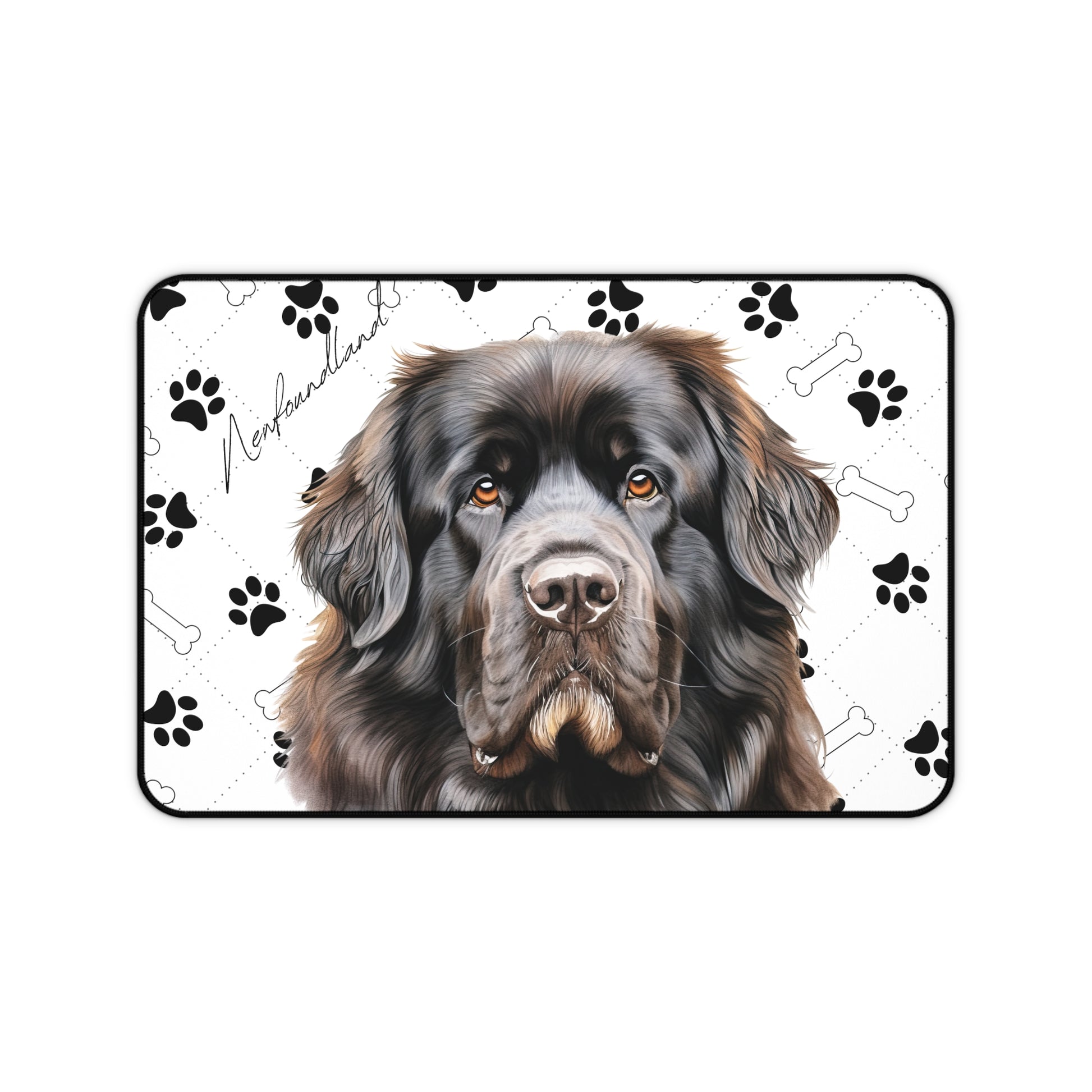 Introducing the Newfoundland Desk Mat, a stately and practical addition to your workspace that celebrates the gentle strength and loyal companionship of the Newfoundland breed. Known for their massive size, thick coat, and kind-hearted nature, the Newfoundland is elegantly depicted on this desk mat, set against a charming backdrop of paw prints and bones. This design not only pays homage to the breed's gentle demeanor and protective instincts but also adds a touch of warmth and tranquility to your desk.