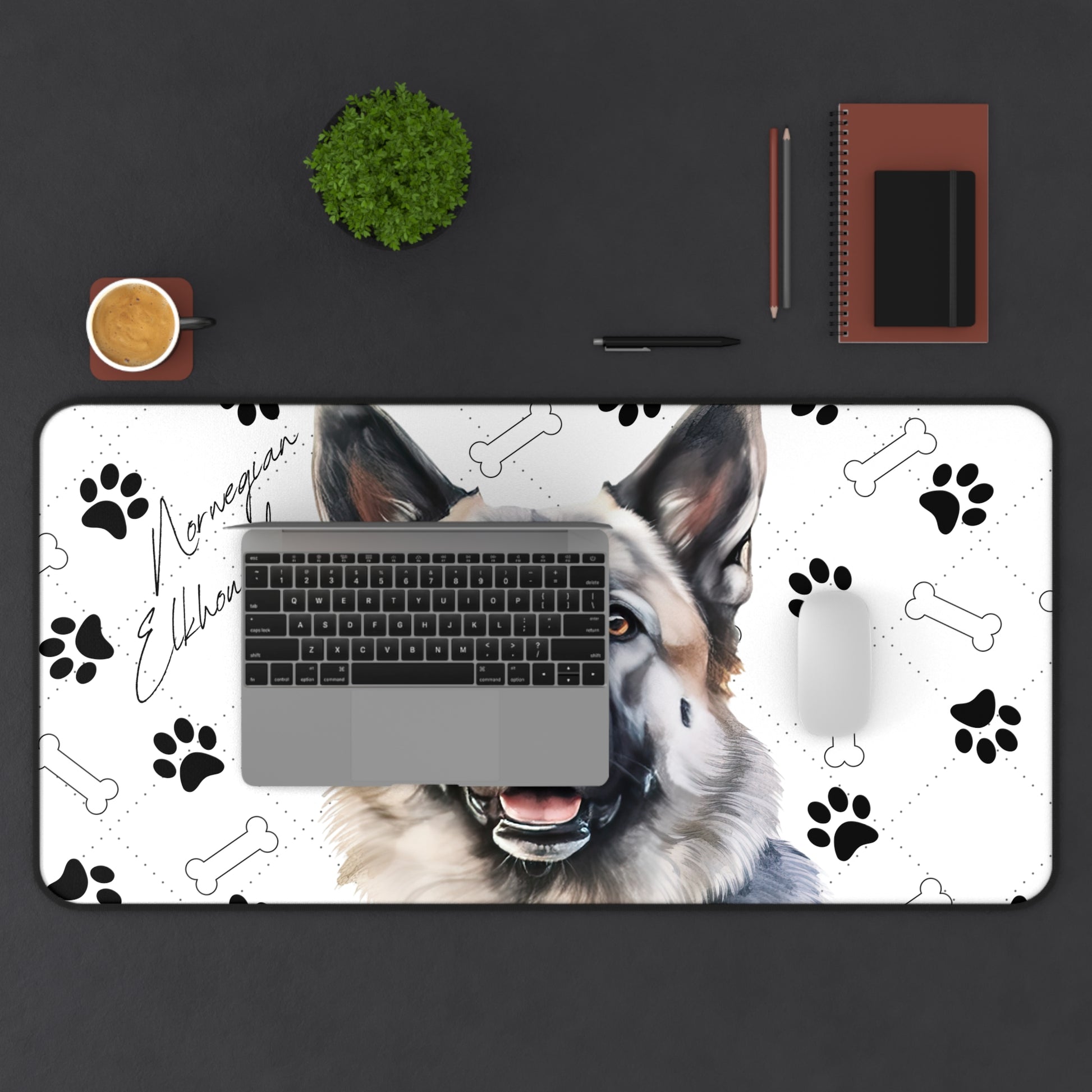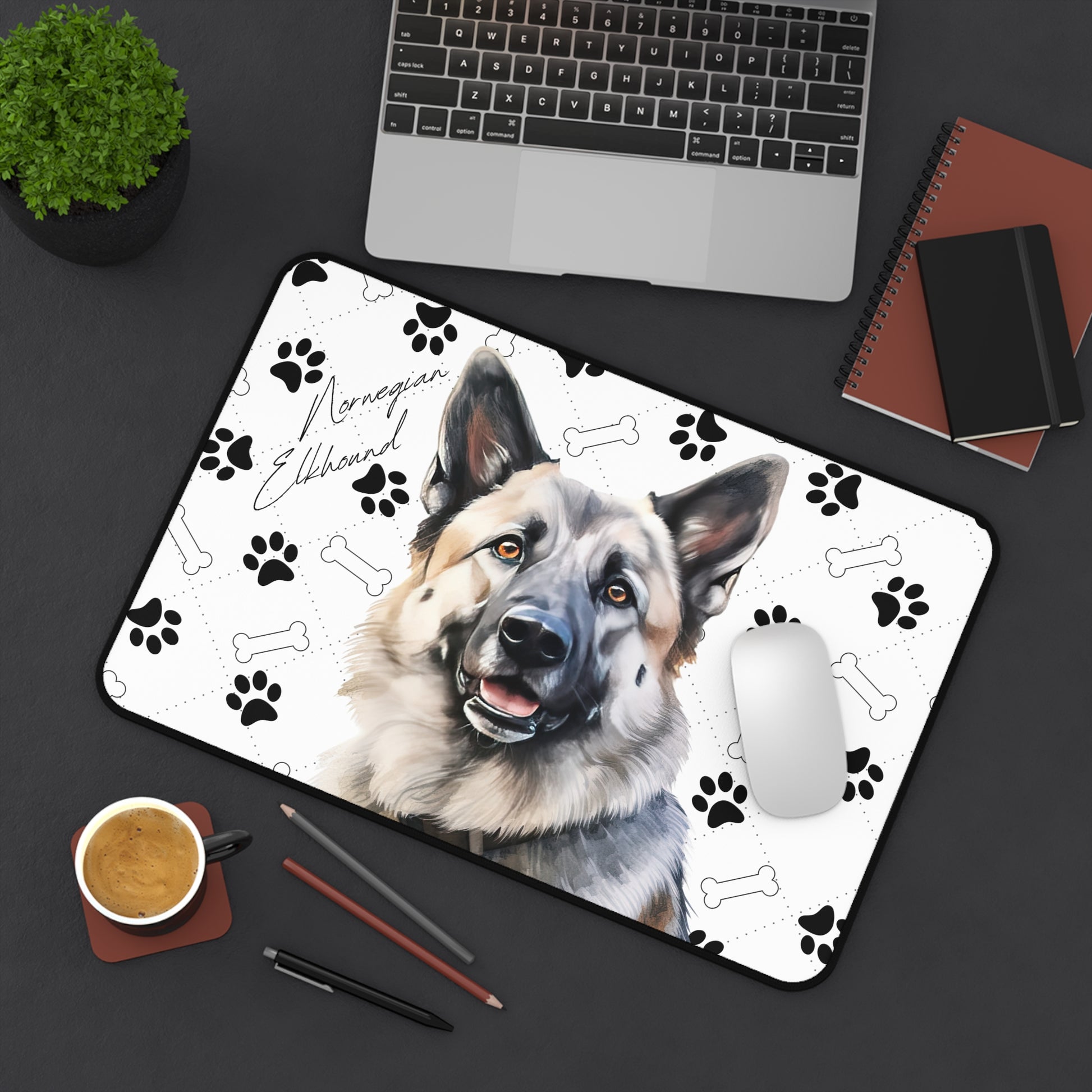 Introducing the Norwegian Elkhound Desk Mat, a rugged yet refined addition to your workspace that celebrates the strength, intelligence, and enduring loyalty of the Norwegian Elkhound breed. Known for their striking silver-gray coat, keen expression, and unwavering courage, the Norwegian Elkhound is beautifully depicted on this desk mat, set against a rustic backdrop of paw prints and bones. This design not only pays homage to the breed's history as a skilled hunter and devoted companion but also adds a touch of wilderness and adventure to your desk.