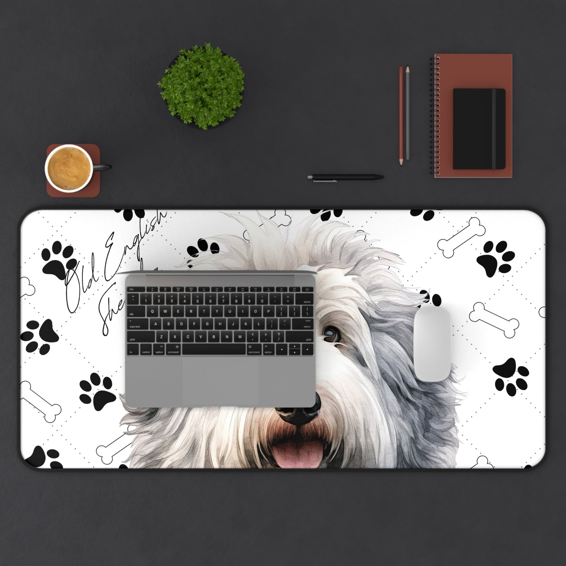 Introducing the Old English Sheepdog Desk Mat, a charming and functional addition to your workspace that celebrates the timeless appeal and endearing nature of the Old English Sheepdog breed. Known for their distinctive shaggy coat, sweet expression, and playful personality, the Old English Sheepdog is beautifully depicted on this desk mat, set against a whimsical backdrop of paw prints and bones. This design not only pays homage to the breed's history as a loyal companion and hardworking herder but also adds a touch of nostalgia and warmth to your desk.