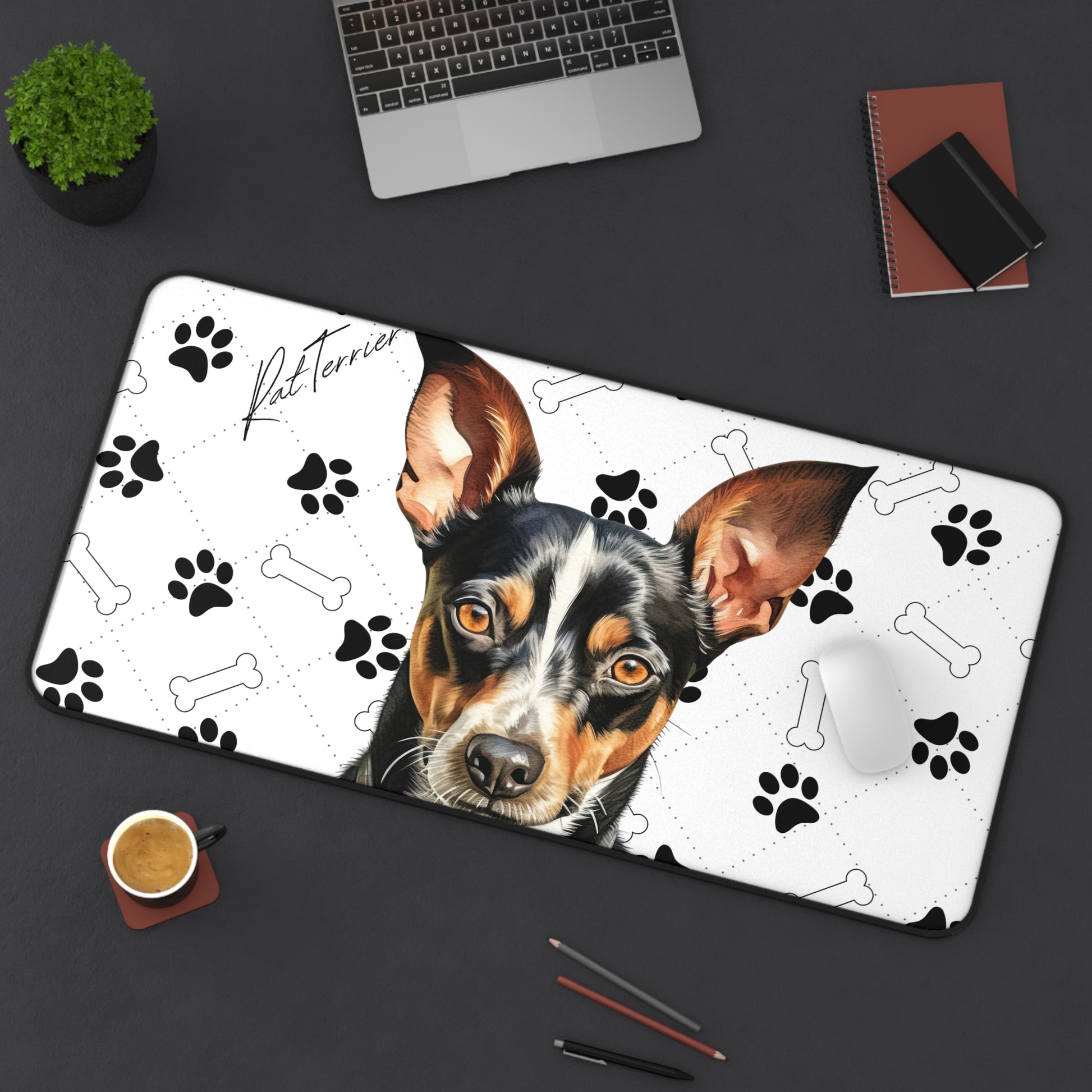 Introducing the Rat Terrier Desk Mat, a dynamic and practical addition to your workspace that celebrates the intelligence, agility, and tenacity of the Rat Terrier breed. Known for their sleek build, alert expression, and boundless energy, the Rat Terrier is beautifully depicted on this desk mat, set against a charming backdrop of paw prints and bones. This design not only pays homage to the breed's history as a skilled hunter and loyal companion but also adds a touch of dynamism and vitality to your desk.
