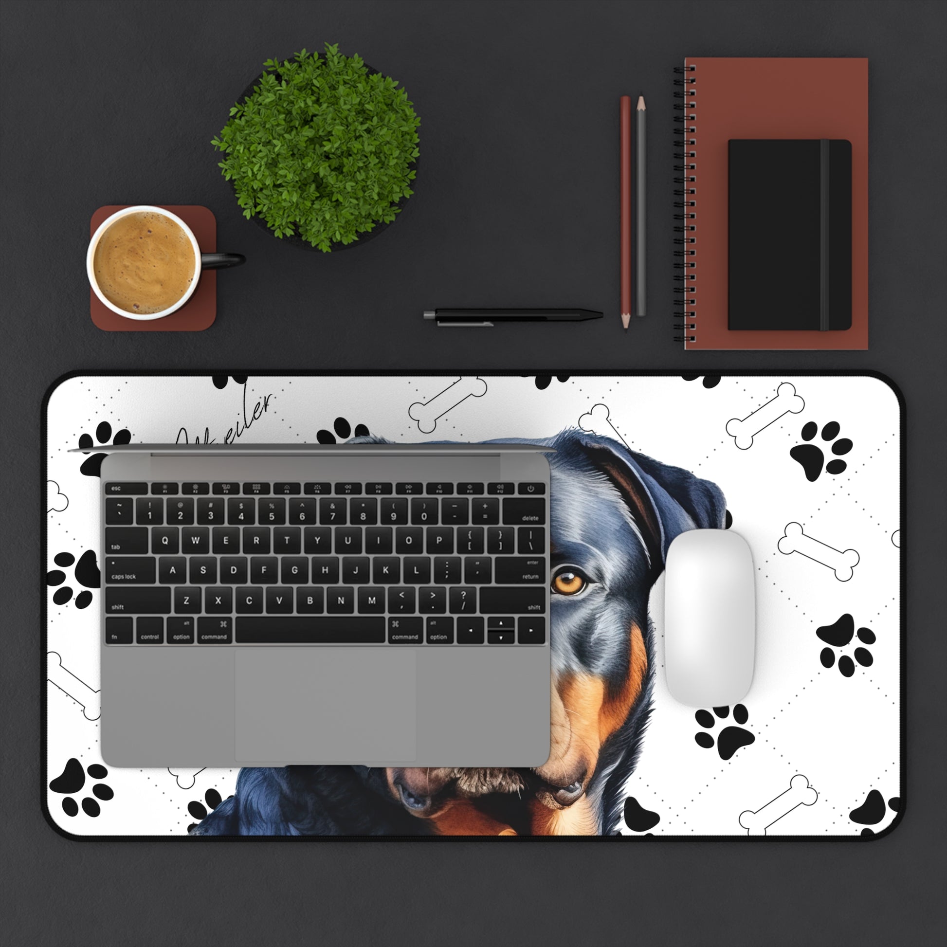 Introducing the Rottweiler Desk Mat, a sturdy and practical addition to your workspace that celebrates the strength, loyalty, and protective nature of the Rottweiler breed. Known for their robust build, confident expression, and unwavering devotion, the Rottweiler is beautifully depicted on this desk mat, set against a rugged backdrop of paw prints and bones. This design not only pays homage to the breed's history as a versatile working dog and cherished family companion but also adds a touch of resilience and determination to your desk.