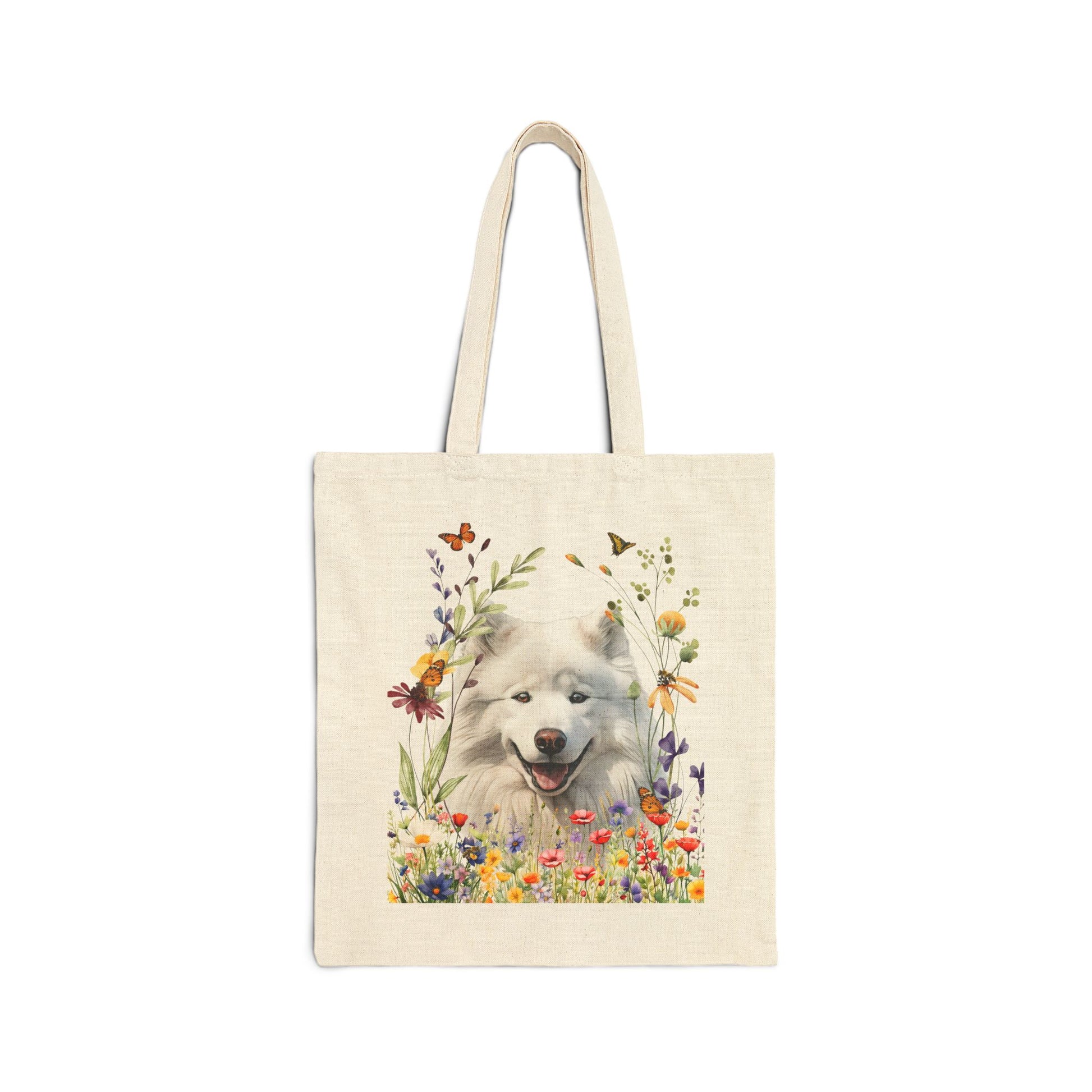 Fluffy, friendly, and full of sunshine—the Samoyed is delightfully captured on this cheerful canvas tote. Surrounded by soft wildflowers and fluttering butterflies, the design highlights the breed’s trademark smile, cloud-like coat, and warm, joyful presence. Known for their gentle nature and boundless affection, Samoyeds are the perfect blend of beauty and heart.