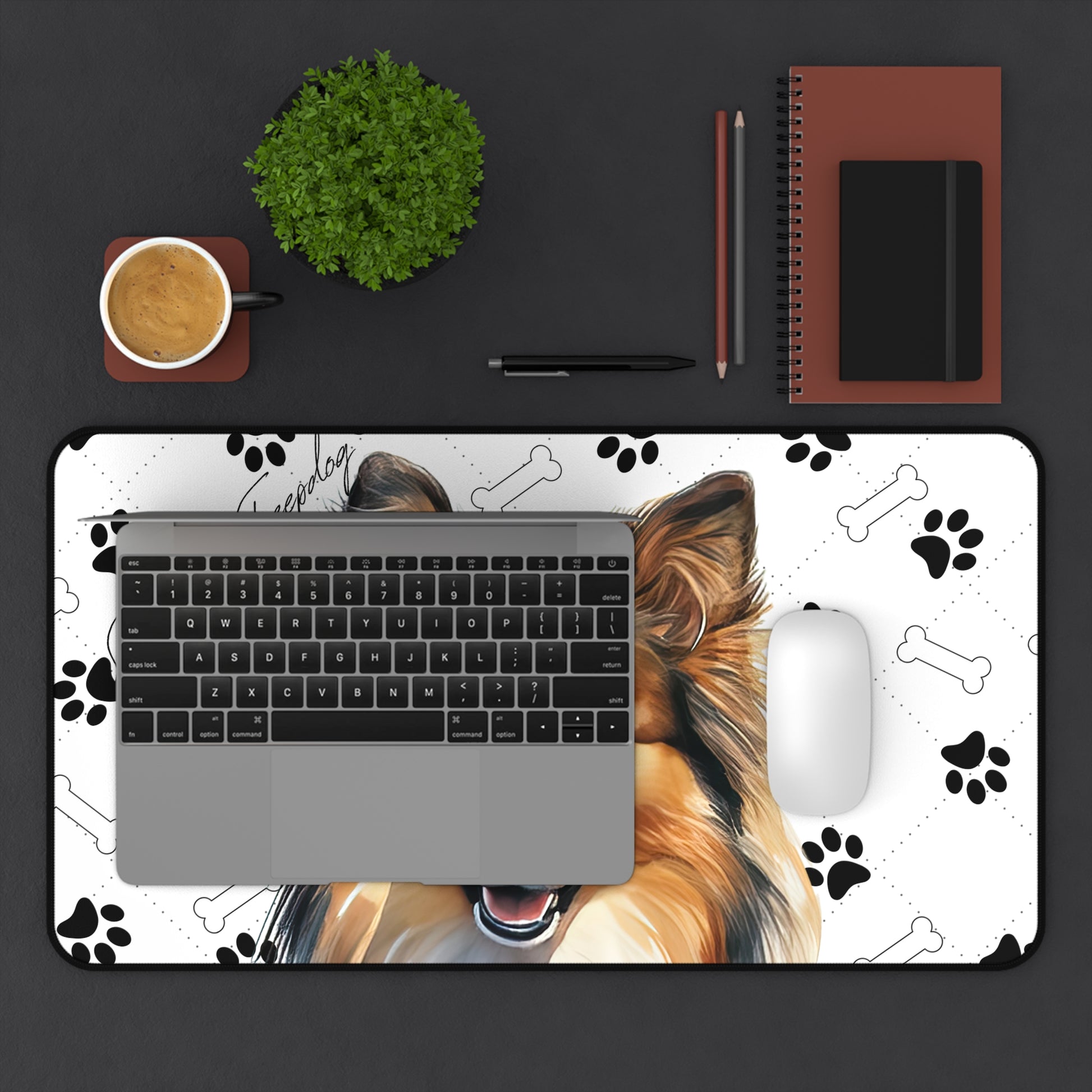 Introducing the Shetland Sheepdog Desk Mat, a charming and practical addition to your workspace that celebrates the intelligence, agility, and gentle nature of the Shetland Sheepdog breed. Known for their beautiful coat, expressive eyes, and eager-to-please demeanor, the Shetland Sheepdog is beautifully depicted on this desk mat, set against a delightful backdrop of paw prints and bones. This design not only pays homage to the breed's history as a hardworking herder and devoted companion but also adds a touch of warmth and coziness to your desk.