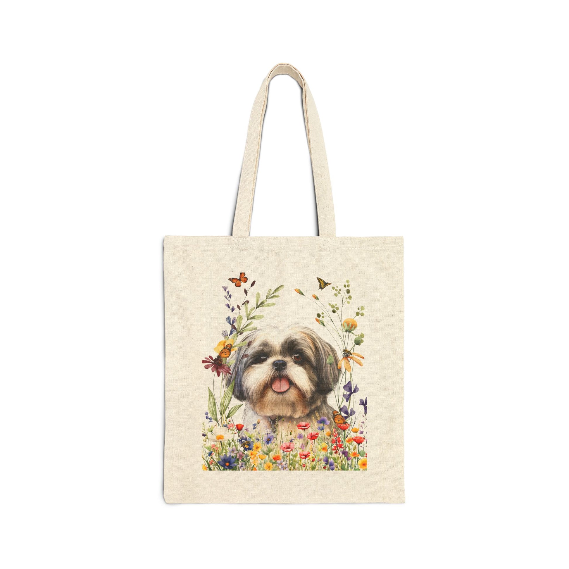 Sweet, regal, and full of affection—the Shih Tzu is beautifully captured on this elegant canvas tote. Surrounded by delicate wildflowers and fluttering butterflies, the design highlights the breed’s flowing coat, round eyes, and charming expression. Once the prized companion of Chinese emperors, the Shih Tzu still carries itself with a gentle grace and loving heart.