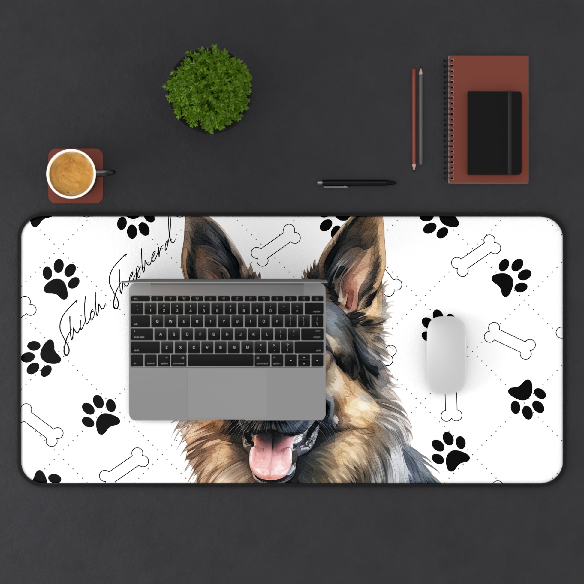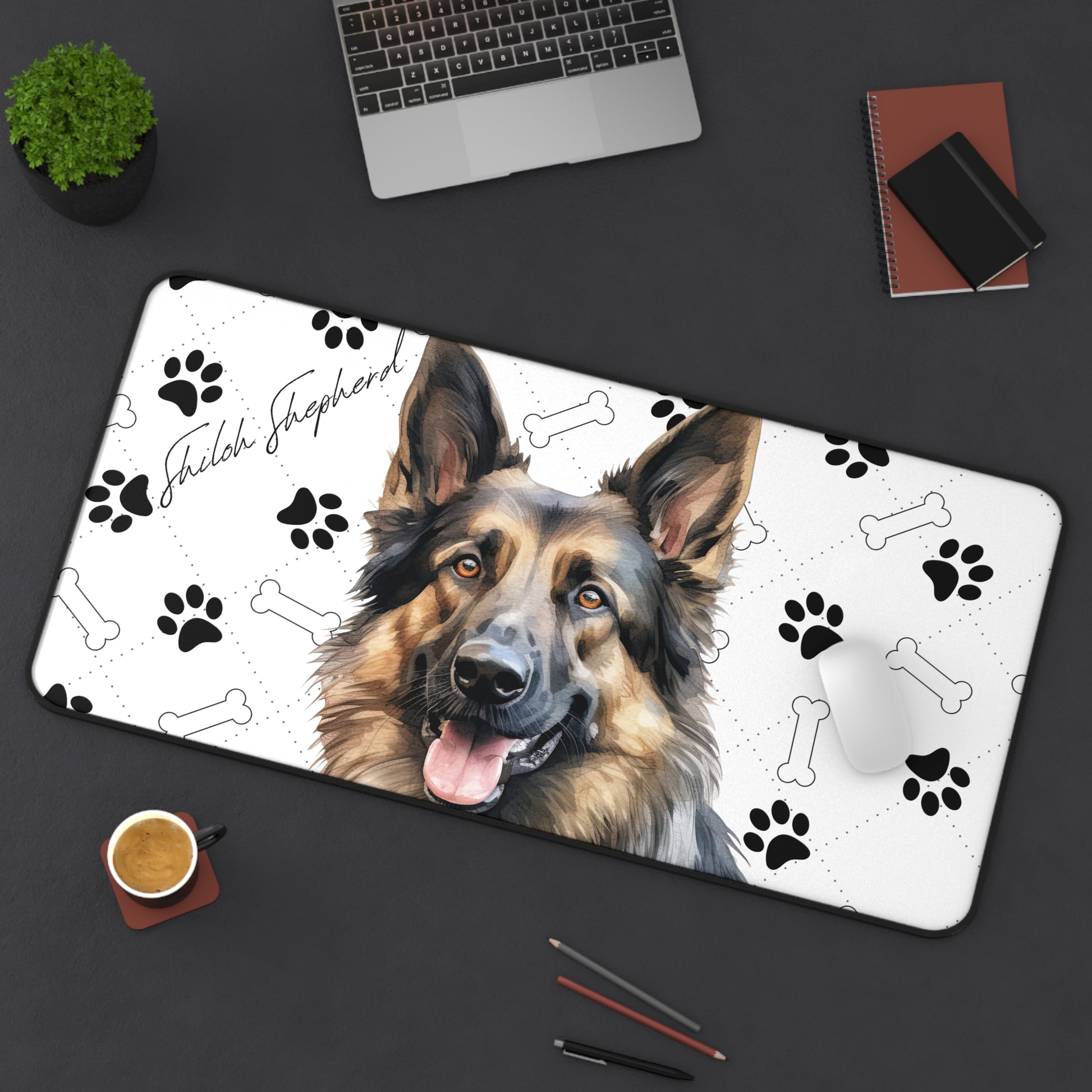 Introducing the Shiloh Shepherd Desk Mat, a versatile and practical addition to your workspace that celebrates the strength, loyalty, and gentle nature of the Shiloh Shepherd breed. Renowned for their majestic appearance, intelligence, and devotion, the Shiloh Shepherd is beautifully depicted on this desk mat, set against a backdrop of charming paw prints and bones. This design not only pays homage to the breed's history as a versatile working dog and beloved family companion but also adds a touch of elegance and warmth to your desk.