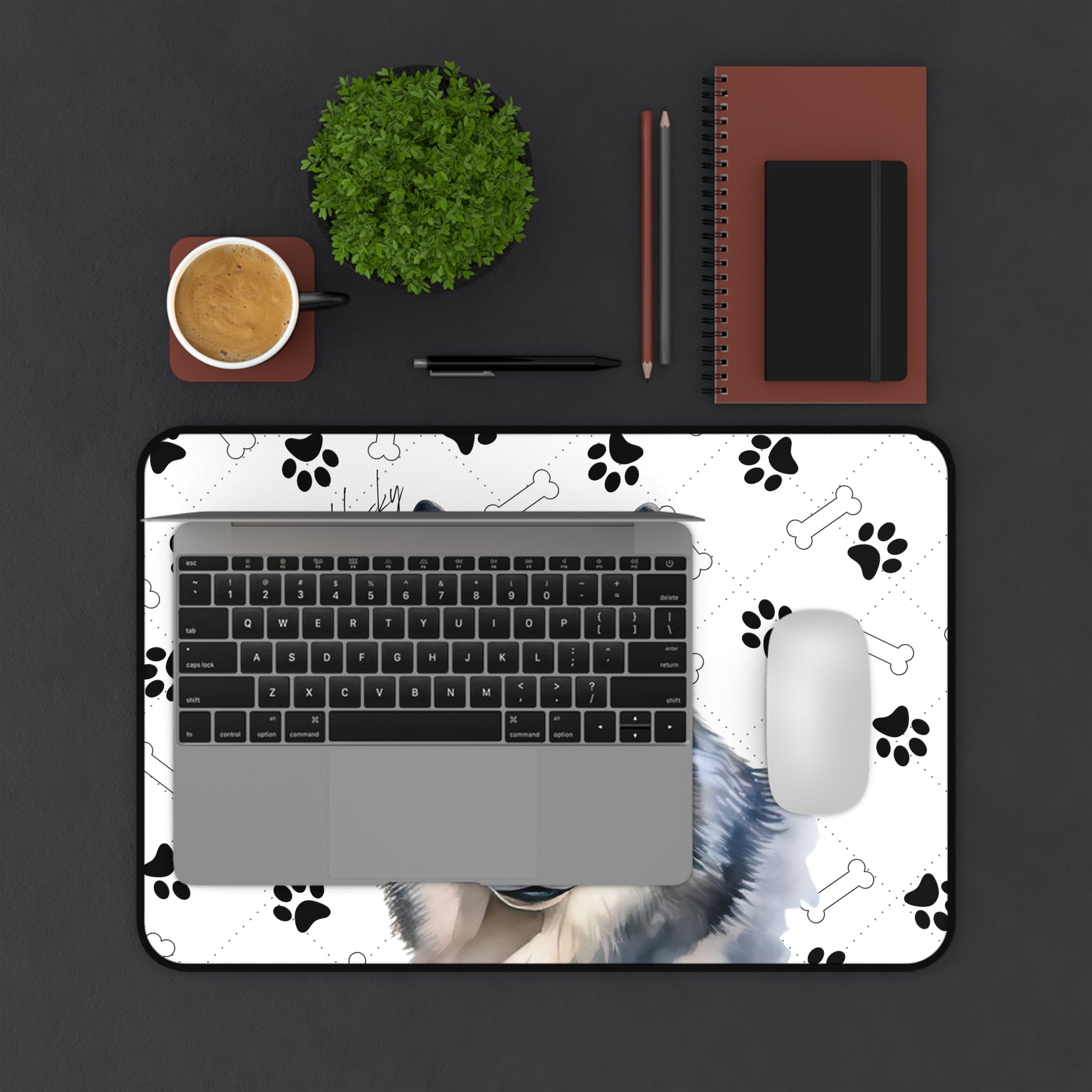 Introducing the Siberian Husky Desk Mat, a stylish and practical addition to your workspace that celebrates the beauty, athleticism, and adventurous spirit of the Siberian Husky breed. Known for their striking appearance, intelligence, and friendly disposition, the Siberian Husky is beautifully depicted on this desk mat, set against a backdrop of charming paw prints and bones. This design not only pays homage to the breed's history as a loyal sled dog and beloved family companion but also adds a touch of excitement and energy to your desk.
