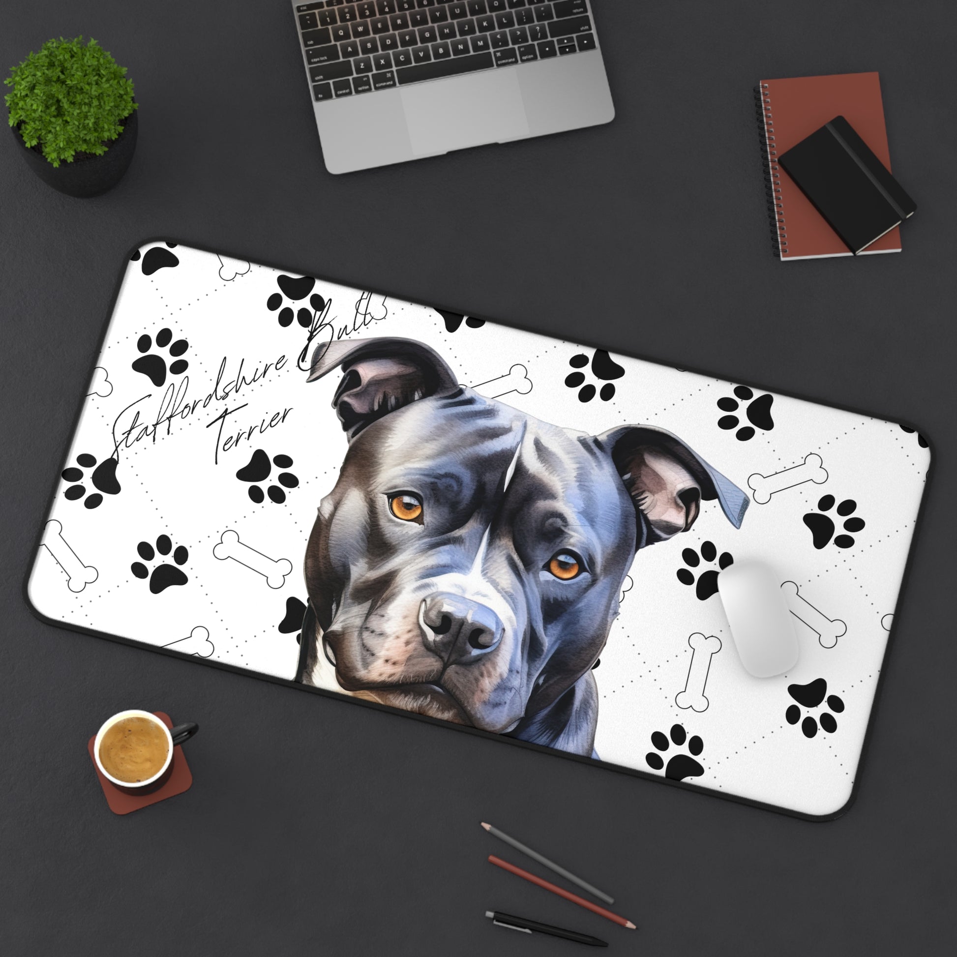 Introducing the Staffordshire Bull Terrier Desk Mat, a versatile and practical addition to your workspace that celebrates the strength, loyalty, and affectionate nature of the Staffordshire Bull Terrier breed. Known for their muscular build, courageous demeanor, and loving disposition, the Staffordshire Bull Terrier is beautifully depicted on this desk mat, set against a backdrop of charming paw prints and bones. This design not only pays homage to the breed's history as a resilient working dog and devoted family companion but also adds a touch of warmth and character to your desk.